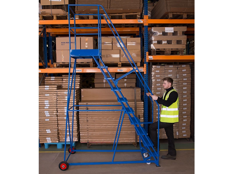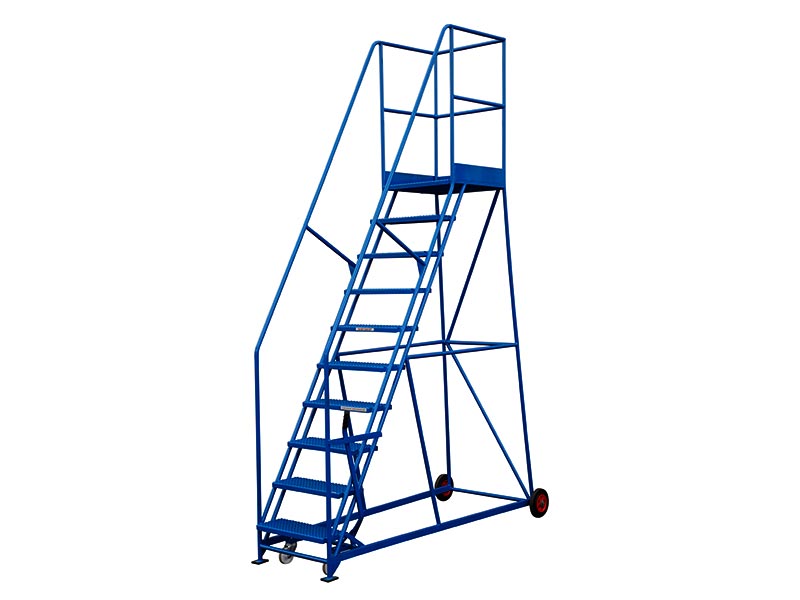 10 tread, welded steel construction steps. Platform height: 2286 mm. Average working height of 3786mm. Overall dimensions: 3236(H) x 991(W) x 2095(L) mm. Platform dimensions: 610 (W) x 585 (L) mm. 560mm wide steps. Hand lever locking mobilises/immobilises steps. Rubber or punched metal treads. Available in a range of sizes: see our full range of safety steps. All our steps are manufactured to order, therefore please check all dimensions thoroughly as we are unable to accept any returns. Front section: 1050(H) x 650(W) x 3620(L) mm.