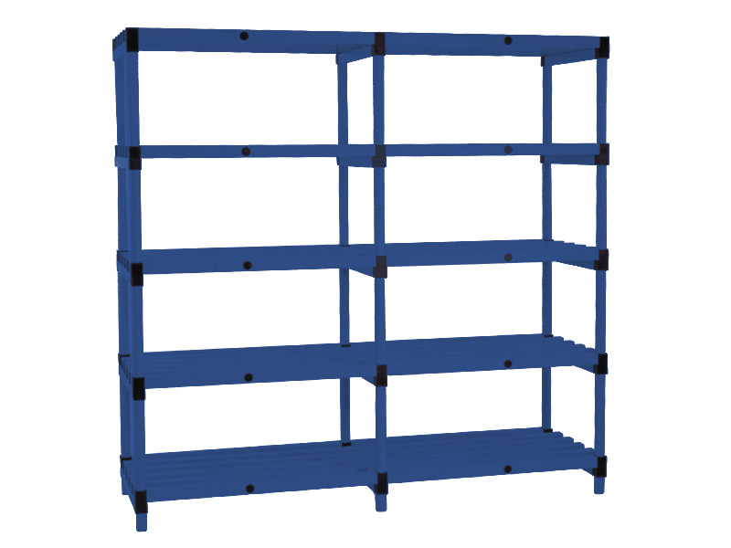 Modular shelving, can form virtually any layout. Very easy to assemble, dismantle and clean. Resistant to moisture and chemicals, corrosion resistant. 5 shelf bay. Lightweight and very strong, 180kg load capacity per square metre length.