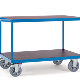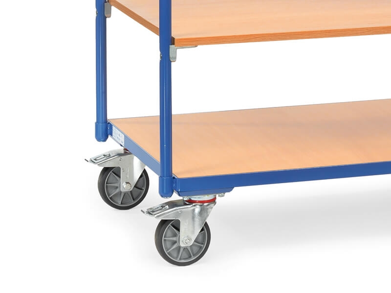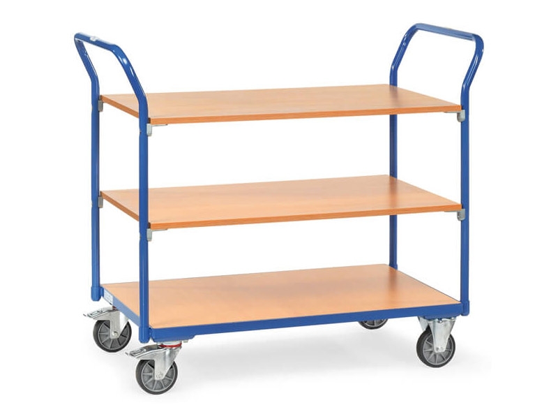 3 shelf table top trolley with a 200kg capacity. Made from strong tubular welded steel. Spacious beech faced particle board platform. 80kg top/middle shelf load. Two swivel braked and two fixed 125mm castors. Hubbed castors with non-marking TPE tyres. Comes with generous 10 year warranty. Finished with Blue RAL5007 powder coating. Now available in any colour – details.