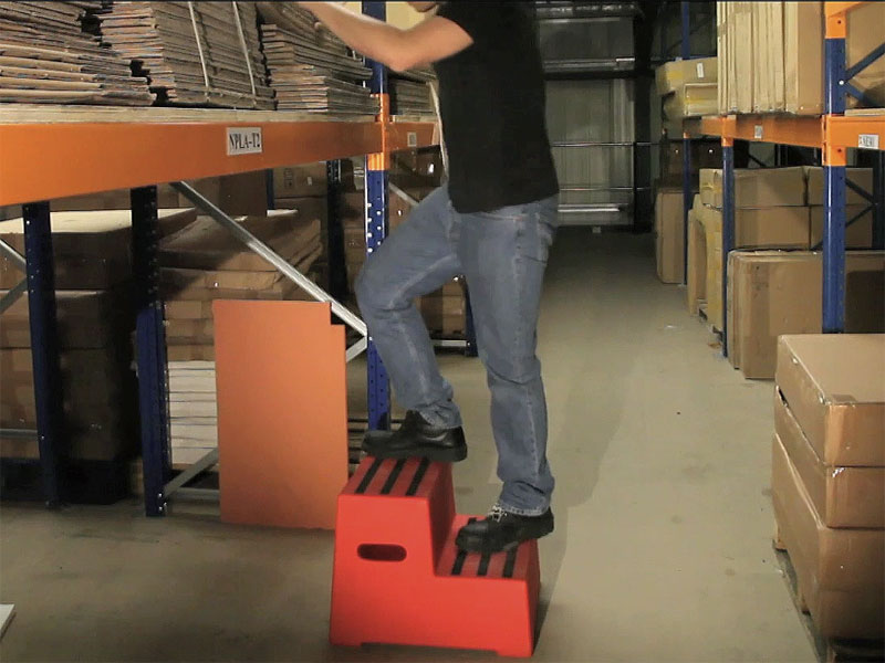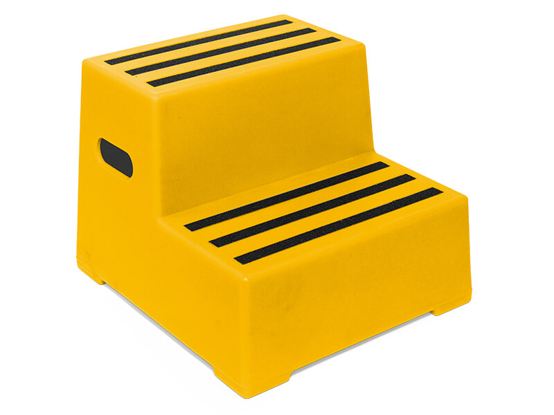 Durable and manufactured from medium density polyethylene. Popular for wash down environments. Available colours: blue, green, red and yellow. Abrasive strip provides effective anti-slip surface. Moulded plastic resistant to most chemicals. 250kg capacity steps. 2 step design.