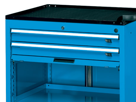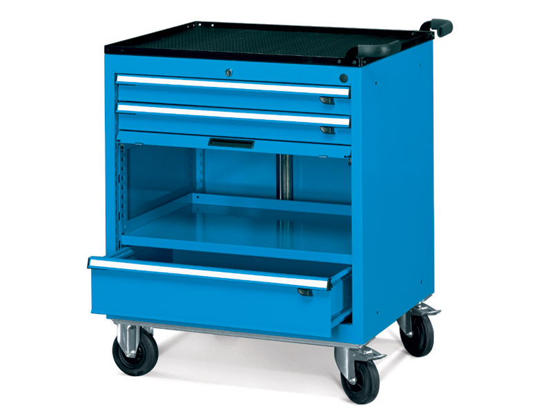 Strong steel construction. 900kg capacity, Drawers 50kg UDL. Individual drawer locks. 2 fixed & 2 braked swivel wheels. Drawer Dimensions (mm): 2 x 75, 1 x 150. 1 adjustable shelf. 1 x 300mm high flap door with full extension. Overall Dimensions (mm): 920 (H) x 792 (W) x 600 (D). Blue.