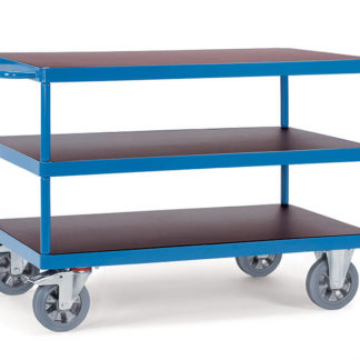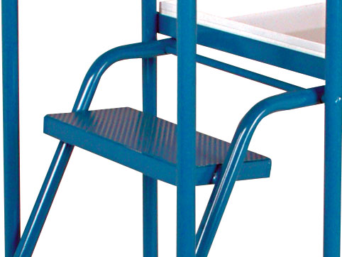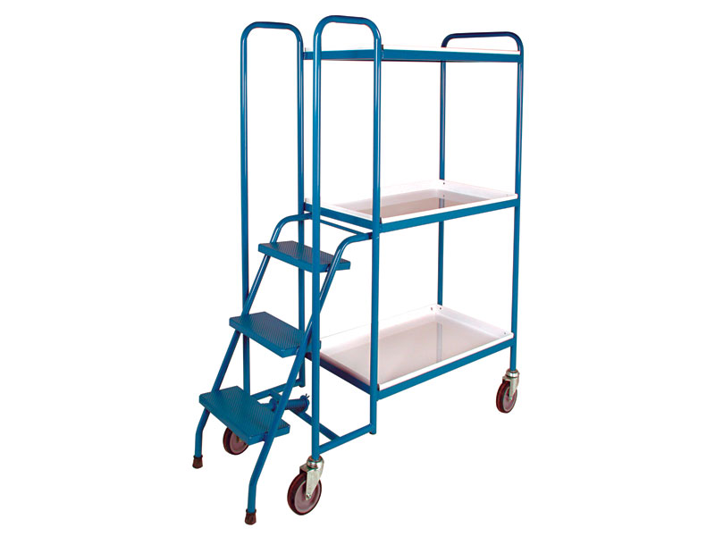 Steel tubular trolley with integral spring loaded steps. 760 x 460 x 40mm deep powder coated steel trays. Non slip safety treads on steps. 750mm Height to top step. 3 Shelves. 310mm, 860mm, 1420mm shelf heights.