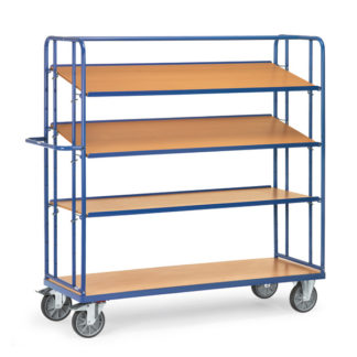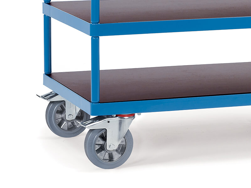 1200kg capacity 3 shelf platform trolley. Tubular welded steel construction. 3 shelves. Shelf heights at 283, 604, and 925mm. 2 fixed and 2 swivel 200mm dia nonmarking grey TPE wheels. Blue powder coated finish as standard. Complies with EuroNorm 1757-3. Now available in any colour – details.
