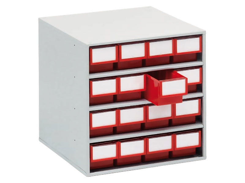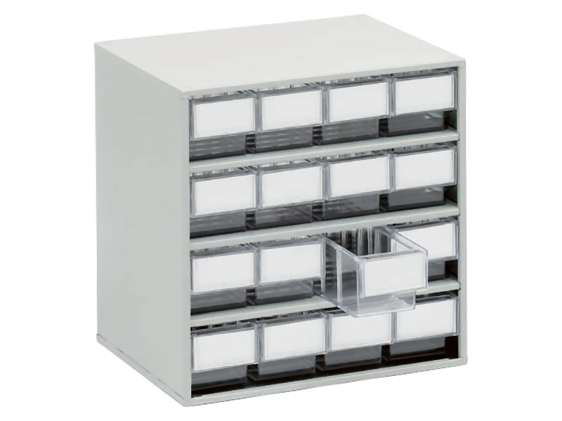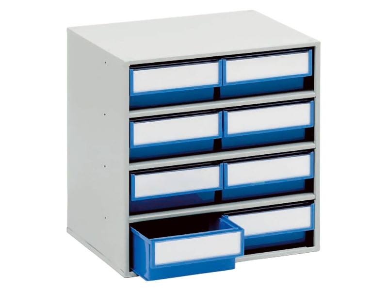 Grey epoxy enamelled cabinets for organised storage. Cabinet comes complete with coloured polypropylene storage bins. Storage bins have corrugated bases for smaller item picking. Can be hung on the wall. Stood on the worktop. Can be stacked vertically. Can be mounted on a turntable.
