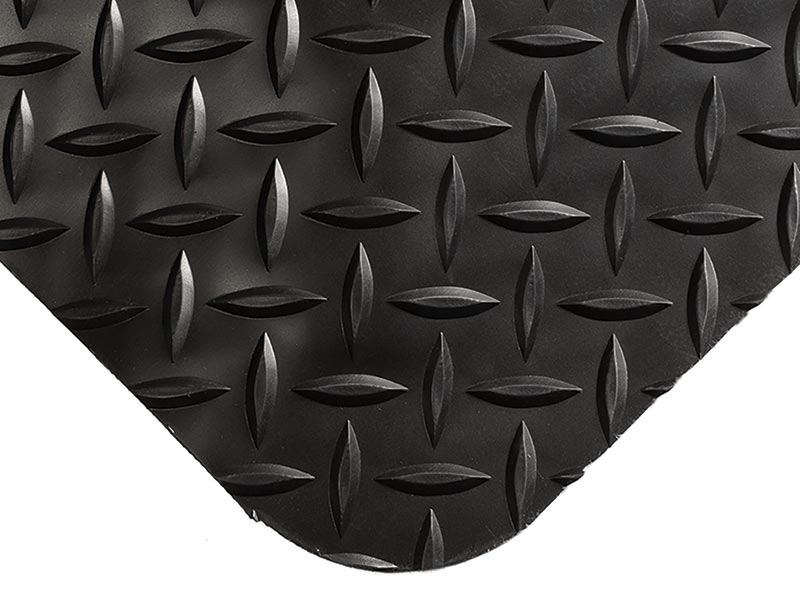 Top choice for heavy use, mainly dry work areas. Tough, slip-resistant checker plate surface. Comfortable and resilient air-cushioned backing. Ramped safety edges fit flush to sub floor. Plain black or black with yellow border. Thickness: 14mm.