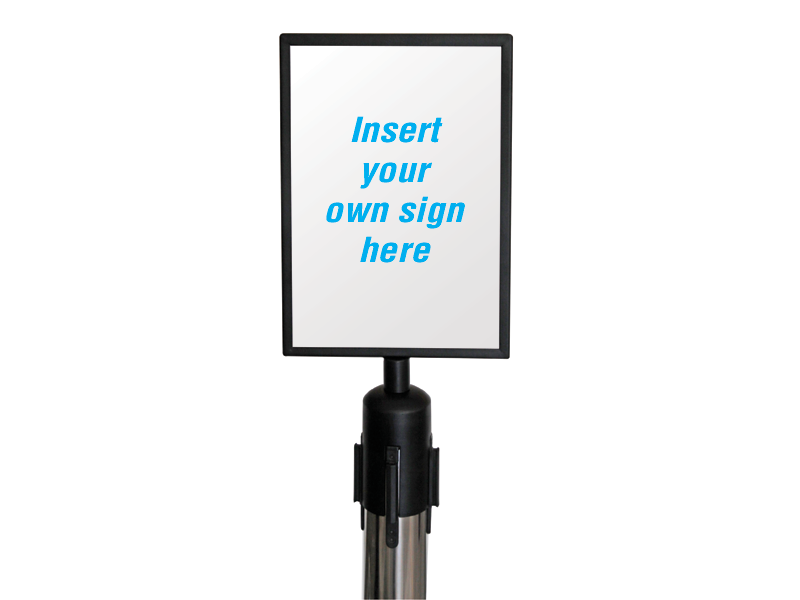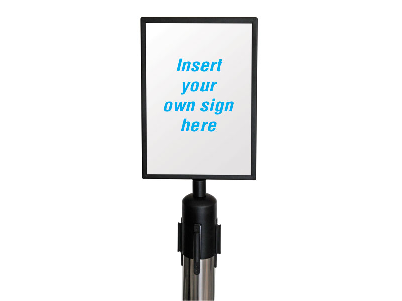 Sign holder for use with belt barriers. Powder coated black finish. See-through acrylic front to hold the message. A4 portrait size. The belt barrier signholder weighs 680g.