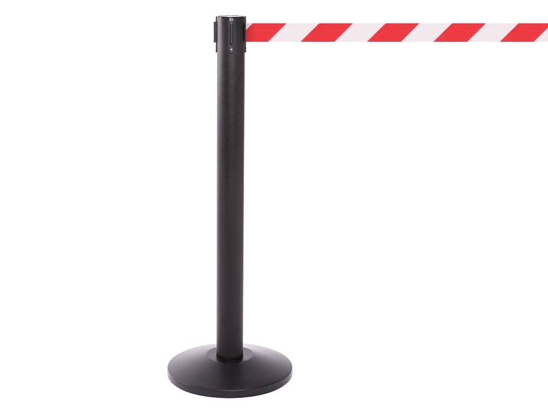 Black post with retractable chevron belt. Post: 1015mm (H) x 75mm (Dia). Base: 355mm (Dia). Belt: 50mm (W) x 4.9m (L). Weight: 11kg.