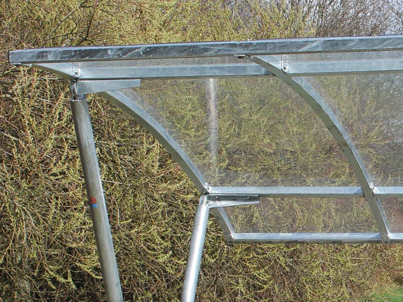 Robust galvanised mild steel frame. 76mm round tube uprights; 50mm square tube roof frame. 3m inside length accommodates an 8-cycle Multirack or up to 4 Sheffield cycle racks at 750mm centres. Designed for on site assembley. 4mm clear PET sheet roof. Free standing. 2200-1400H x 2680Dmm. Bike Racks not included.
