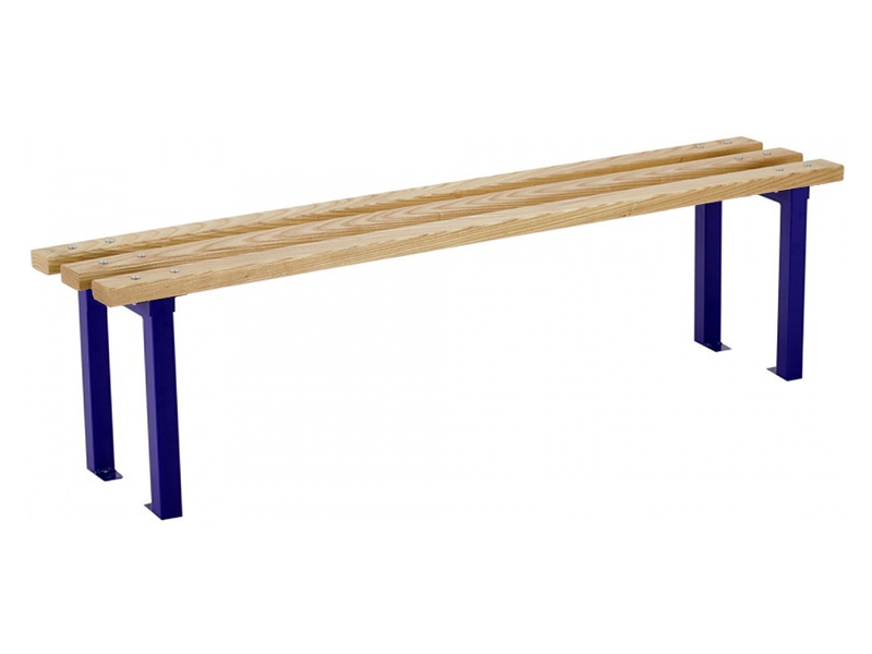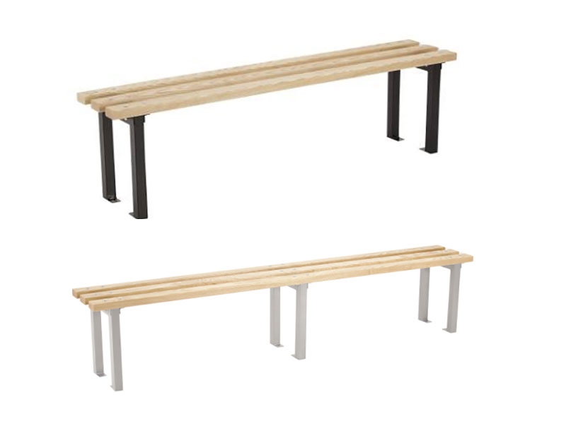 Tough polyester powder coated finish on 38mm x 38mm steel frames. Choice of 3 frame colours – black, blue or silver. 400mm height x 300mm deep. Can be fixed to floor with adjustable foot shown in photograph (floor bolts not included). 3 ash hardwood slats each measure 70mm wide x 32mm thick. Slats are sanded, sealed & lacquered for a quality finish. Available in three lengths from 2100 to 2700mm. Up to 1500mm bench has 4 legs; 1800mm and over has 6 legs. Requires simple self assembly.