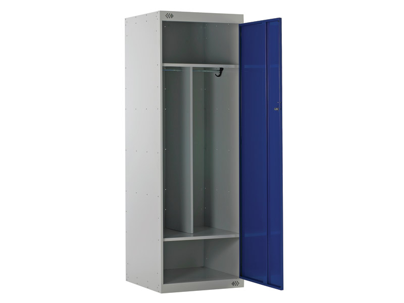 600mm deep locker to accommodate crew clothing and effects. Dimensions (mm) 1800(H) x 600(W) x 600(D). Divided compartments ideal for separating clean/dirty clothes. BioCote protected to inhibit growth of potentially lethal bacteria. Fixed heavy duty top and lower shelves. Heavy duty hanging rail. Grey carcass with blue door.
