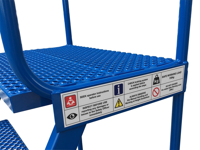Steps are easily manoeuvrable via ‘wheelbarrow style’ handles. Moves freely via fitted rubber wheels. Built with tough reinforced steel frame. 950mm height safety hand-rails on both sides. 559mm width punched-metal treads. 2770mm average working height. Steps are manufactured to order, therefore please check all dimensions thoroughly as we are unable to accept any returns. All of our steps can be bespoke made to your specifications – please call our sales team on 0800 0126777.