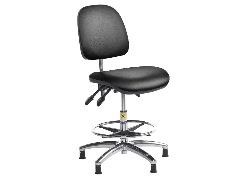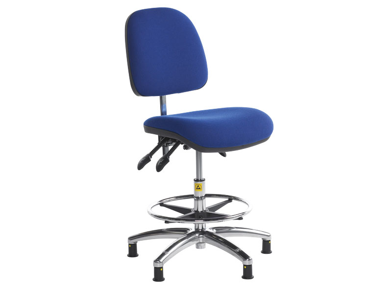 Fully padded ESD fabric upholstered operator chair. Glide base. Footring. Gas lift height adjustment. Variable seat height 500-690mm. Height & angle adjust backrest. Fully EU regulations compliant.