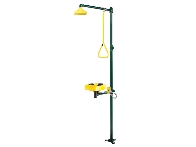 Freestanding emergency station + eye/face wash combined with shower. For emergency decontamination. Impeller action causes the water to swirl softening the impact of the water. 8” impeller action showerhead. Shower Flow pressure: 20psi 1.38bar – Flow rate: 75.7lpm. Eye/Face wash Flow pressure: 30psi 2.07bar – Flow rate: 18.5lpm.