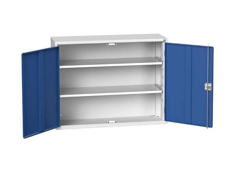 Robust freestanding cupboard constructed of reinforced welded steel. Reinforced doors with 3-point locking. Galvanised steel shelves adjustable at 25mm intervals (60kg UDL capacity). Highly functional, effortless and easy to maintain. Cupboard dimensions: 900(H) x 1050(W) x 350(D). Finished with scratch-resistant epoxy powdercoat. RAL7035 light grey housing and RAL5010 blue fronts. 2 shelves.