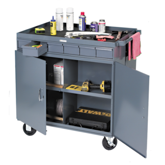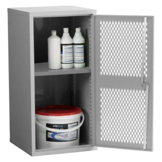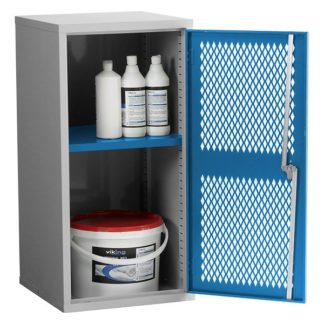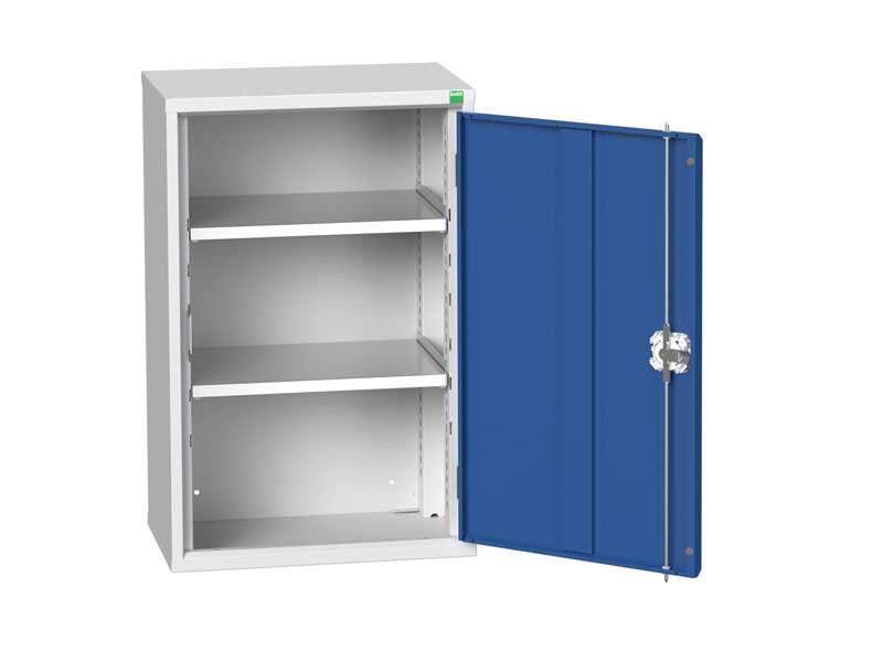 Versatile workshop cupboard that holds a generous volume of equipment. Built with robust reinforced steel composition. 2 x steel shelves positionable to 25mm spacing. Heavy duty doors with three-point locking. External dimensions (mm): 900(H) x 525(W) x 350(D). Protected by scratch-resistant epoxy powder-coat. RAL7035 light grey housing with blue RAL5010 doors.