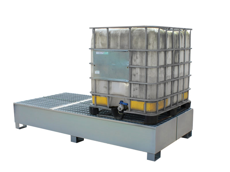 Suitable for the storage of 2 x IBC container. All galvanised strong steel construction. Protect the environment, facilities and team members from hazardous leaks. Dimensions (mm): 465(H) x 1220(W) x 2540(D). Sump capacity (ltr): 1100. Tare weight (kg) 135. Removable steel mesh deck for easy cleaning. 150mm wide fork hoops allow easy moving of the pallet. Hoops ensure the sump underside is clear of the ground.