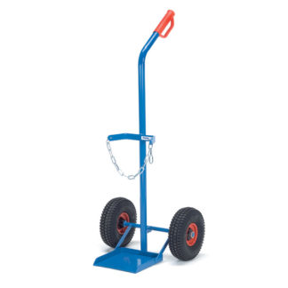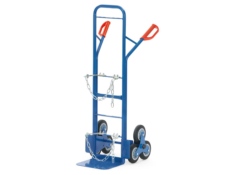Easy transportation of steel gas bottles or cylinders on stairways. 200kg capacity. Suitable for cylinders of 20/40/50 litres or propane gas bottle 11/33kg. Safety chains to stabilise the bottles are provided. Non marking TPW spider wheels 160 x 40mm.