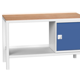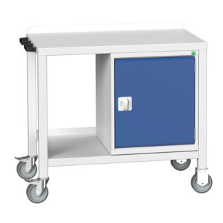 Wide heavy duty welded mobile bench with MPX top and drawer. 1000mm wide, 930mm high, 600mm deep. Handy steel base shelf. Roller bearing central locking drawer (60kg UDL). 125mm diameter castors, 2 with brakes. RAL7035 Grey, Blue Doors (RAL5010). Delivered fully assembled for immediate use.