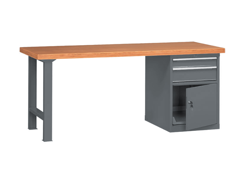 Steel table with a wooden worktop finish. 40mm thick multiplex worktop made from layers of beech wood which is non-deformable and load & wear resistant. Pedestal cabinet with 2 drawers & 1 cupboard, drawers have 100kg load capacity and have an extension of 87% from the cabinet housing. Suitable for a variety of working environments including factory industrial locations and the garage.