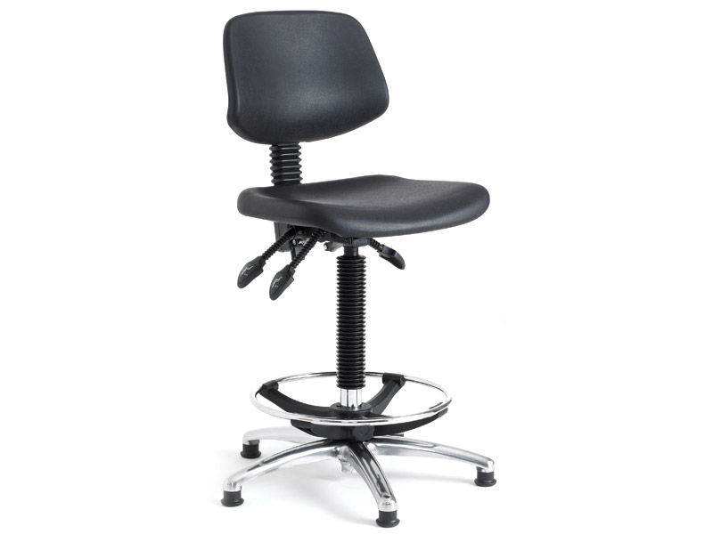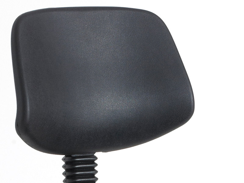 Tough black cushioned polyurethane high lift operator chair. 220H footring & glides. Gas lift height adjustment 550-800mm. Adjustable backrest. Wipe-clean seating for industrial environments. Colour black.
