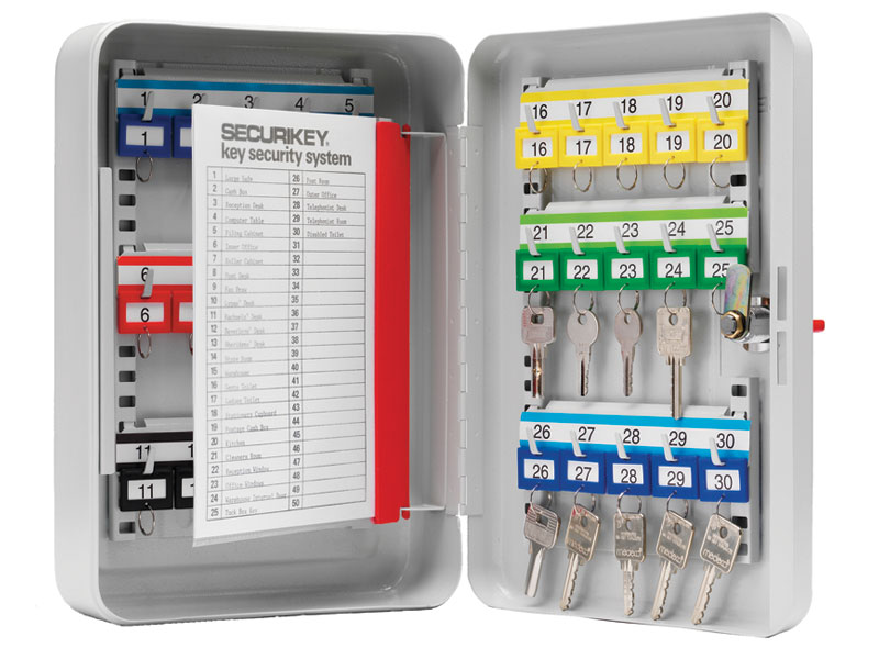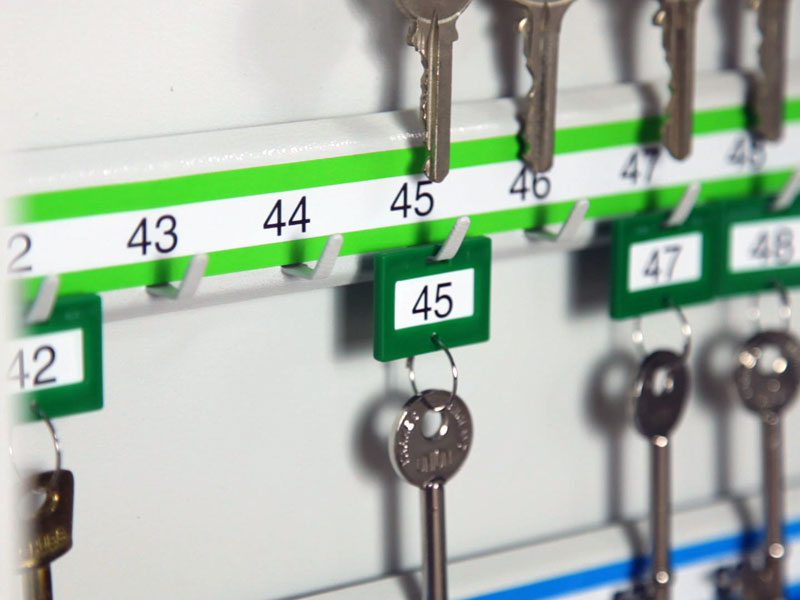Strong steel construction and durable powder coated paint finish. For multiple key storage, 20-600 keys. Key security cabinets, are pre-drilled for wall mounting. Cylinder lock supplied with 2 keys. Colour coded numbered kwy tags to suit hook bars, removable control index.