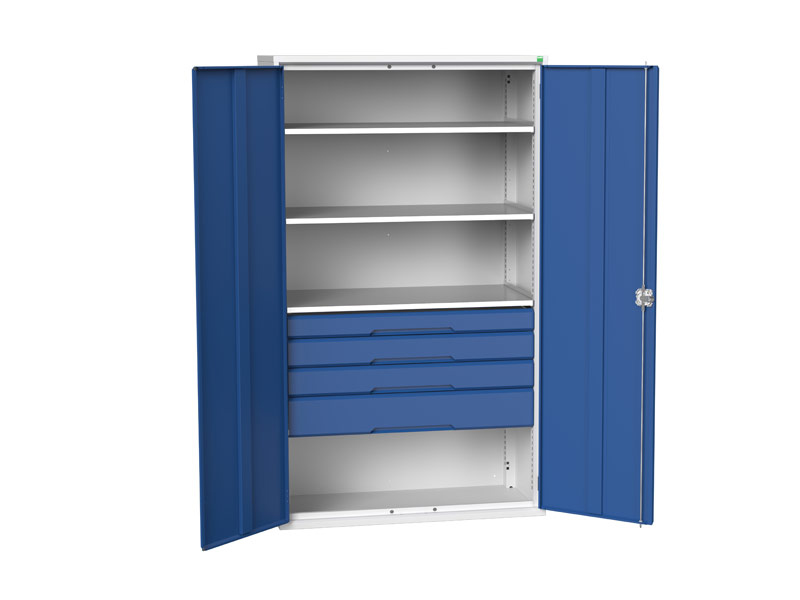 Welded steel construction kitted cupboard ideal for workshops. Combined drawer and shelving storage unit perfect for a range of workplace applications. 3 galvanised steel shelves (60kg UDL Capacity). 4 extension roller bearing drawers (60kg UDL capacity). Reinforced double doors with 3 point lock. Epoxy polyester powder-coat finish. RAL7035 light grey housing with RAL5010 blue door and drawers. Dimensions: 2000(H) x 1050(W) x 550(D) mm. Drawers: 1 x 100mm, 2 x 125mm, 1 x 175mm. Shelves: 3.