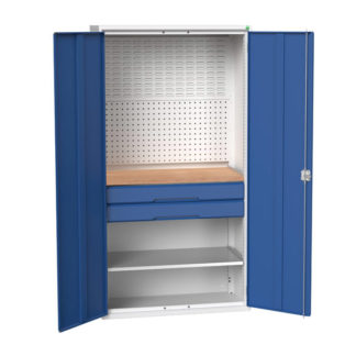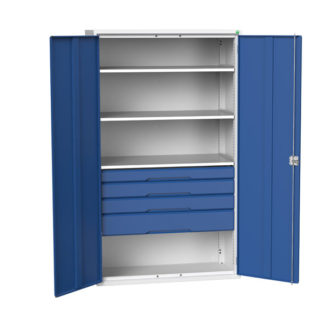 Reinforced welded steel housing workshop kitted cupboard. 2 100% extension roller bearing drawers (60kg UDL capacity). 4 adjustable galvanised shelves (60kg UDL capacity). Plain door fitted with 3-point lock. RAL7035 light grey housing. RAL5010 blue door and drawer fronts. Finished in epoxy polyester powder coat. Dimensions: 2000(H) x 1050(W) x 550(D) mm. Drawers: 2 x 125mm. Shelves: 4.