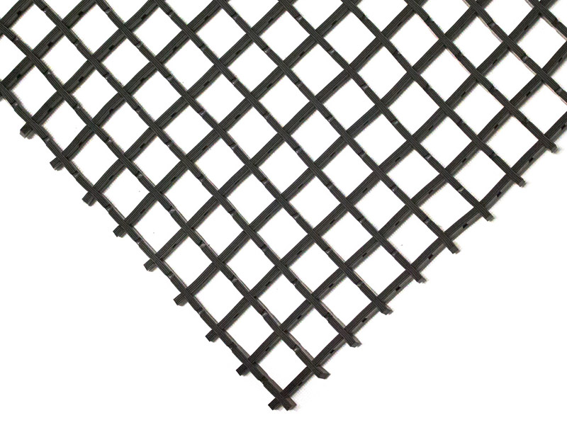 Inter woven PVC mat. Cross ribbed. Resists most oils and solvents. Easy to clean and reversible for maximum usage. 30mm x 30mm hole pitch ideal for wet / debris areas. Fire Resistant. Thickness: 12.5 mm.