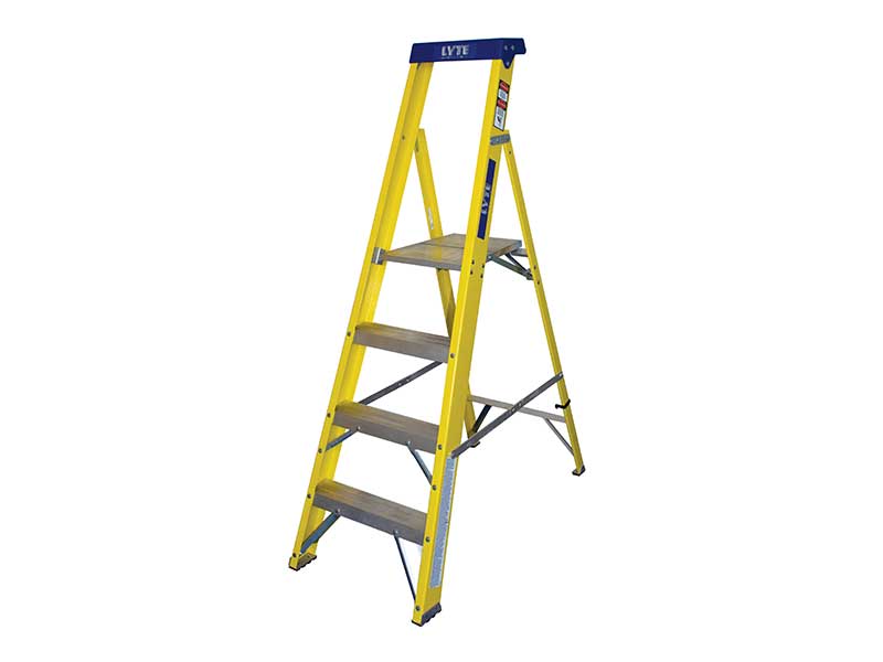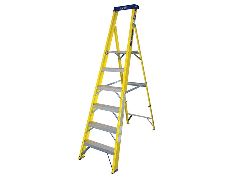 Heavy duty for frequent use. Non-conductive to 30,000 volts. Certified to EN131. Slip resistant treads and feet. Integral tool tray. Double riveted treads for extra strength. The platform step ladders are available in 7 sizes.