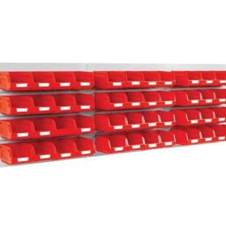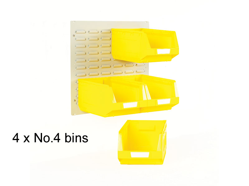 Small bin kit. 1x 500H x 500Wmm steel louvred panel. Bin sizes No.2 (83Hx103Wx165Dmm), No.3 (128Hx148Wx240Dmm) or No.4 (164Hx209Wx356Dmm). Bins available in red, blue, yellow or green.