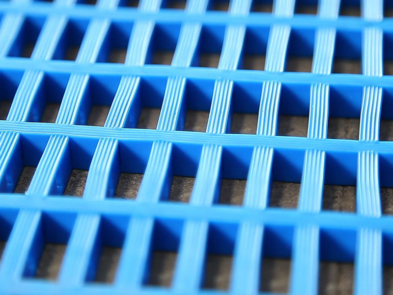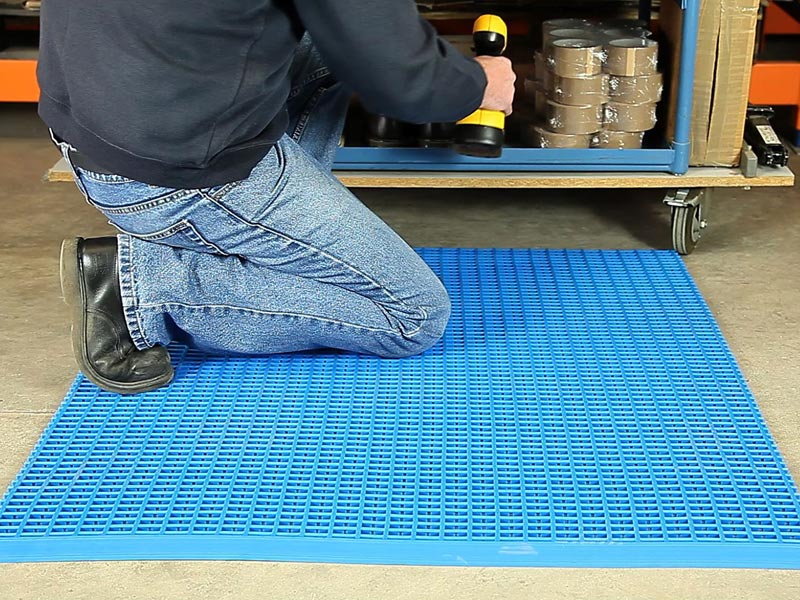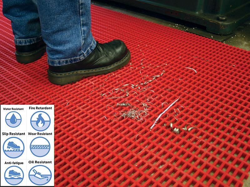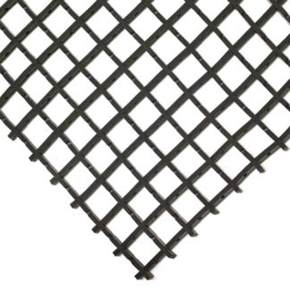 Inter woven PVC mat. Cross ribbed. Resists most oils and solvents. Easy to clean and reversible for maximum usage. 30mm x 10mm hole pitch for max bare foot comfort. Fire tested. Thickness: 12.5 mm.