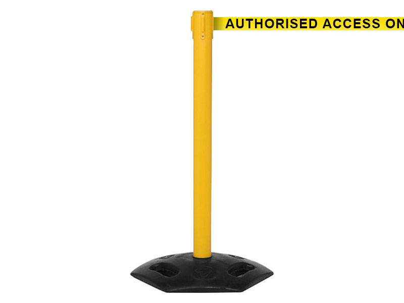 Retractable barriers & posts designed for outdoor use. Heavy duty, no rusting rubber base. Powder coated stainless steel post. Black, red or yellow post – 1015mm high. 50mm wide belt with a choice of barrier message. Belt is 3.4m x 50mm. 9kg.