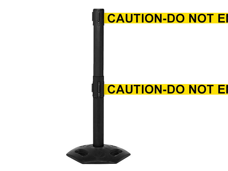 Perfect for harsh environments. Black post, retractable belt. 1015mm high. 64mm diameter post. 480mm diameter base. 50mm belt width. 3.4m belt length. Base unscrews easily from post for storage.