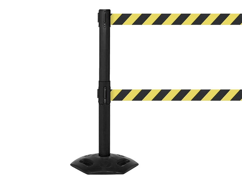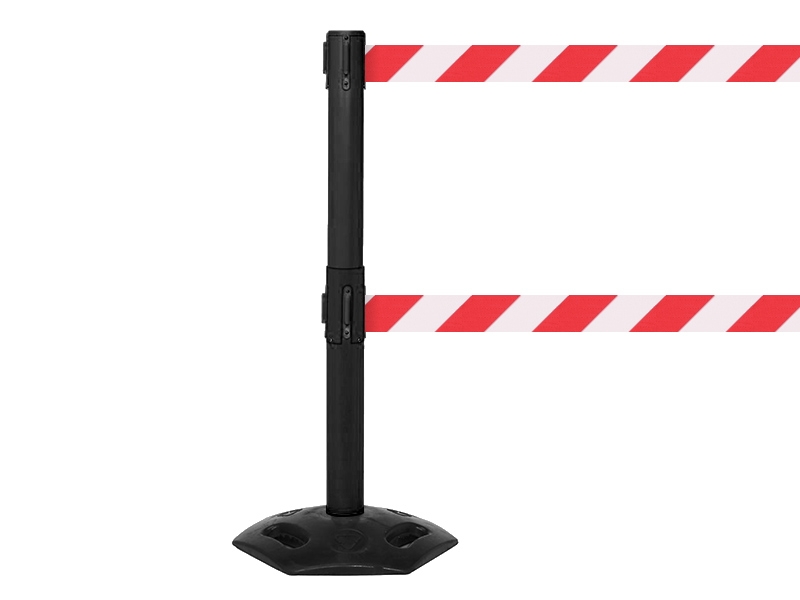 Perfect for harsh environments. Black post, retractable belt. 1015mm high. 64mm diameter post. 480mm diameter base. 50mm belt width. 3.4m belt length. Base unscrews easily from post for storage.