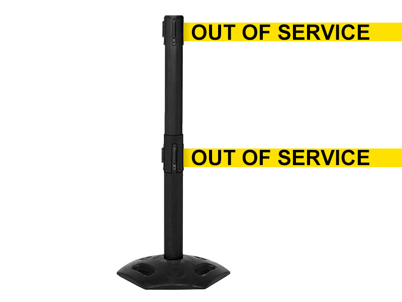 Perfect for harsh environments. Black post, retractable belt. 1015mm high. 64mm diameter post. 480mm diameter base. 50mm belt width. 3.4m belt length. Base unscrews easily from post for storage.