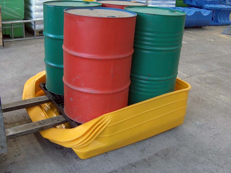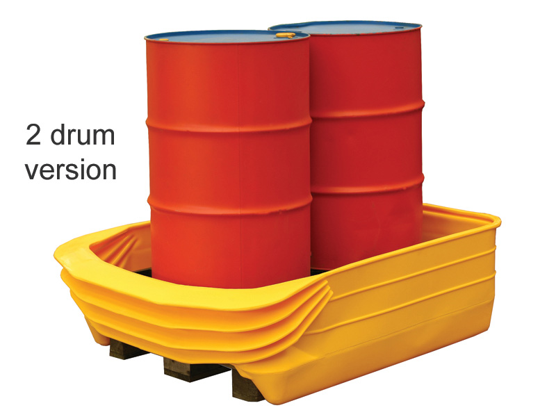Turn a standard wooden or plastic pallet into a bunded pallet. Simply place over an existing pallet and it is ready for use. Unique compressible front allows a loaded pallet to be lowered in by a forklift truck. Made from flexible plastomer. 2 drum and 4 drum versions. Compliant with UK Oil Storage Regulations. Lightweight and easy to handle. Broadband chemical compatibility. Unique compressible front.