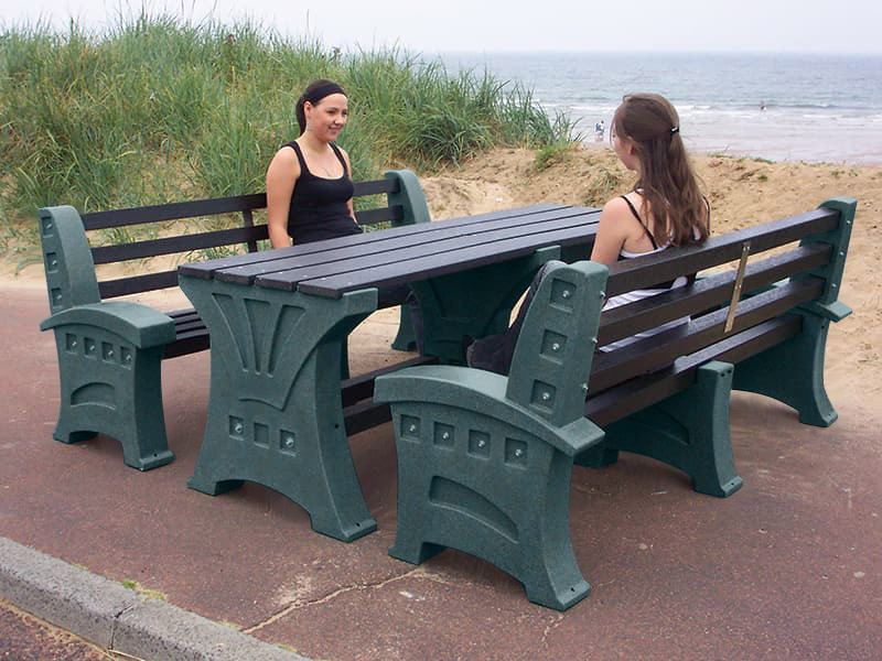 Maintenance free and vandal resistant picnic table and bench. Constructed from eco-friendly recycled plastic. Plastic is fully recyclable. Delivered assembled with fixing bolts included to securely attach to ground. Hygienic and easily cleaned. Available in a range of colours. 720(H) x 2050(W) x 680(D) dimensions.