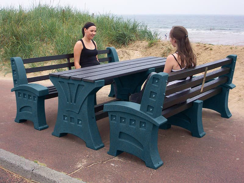 Maintenance free and vandal resistant picnic table and bench. Constructed from eco-friendly recycled plastic. Plastic is fully recyclable. Delivered assembled with fixing bolts included to securely attach to ground. Hygienic and easily cleaned. Available in a range of colours. 720(H) x 2050(W) x 680(D) dimensions.