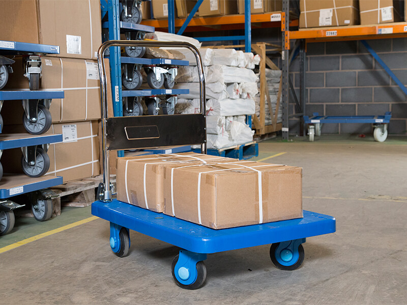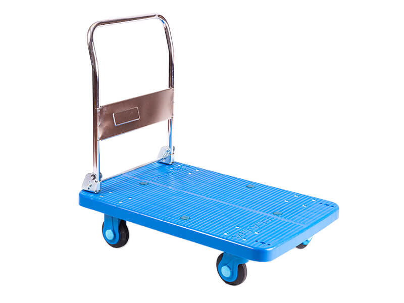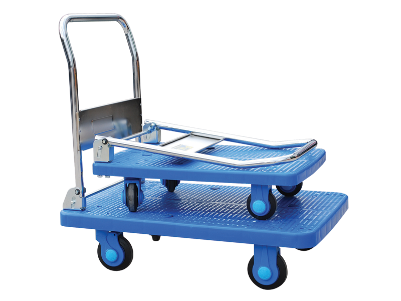 300kg capacity. Reinforced plastic platform. Chromium plated metalwork. Fold down handle for easy storage. Handle height – 880 mm. 210mm platform height. 2 fixed 2 swivel ball bearing castors with polyurethane tyres.