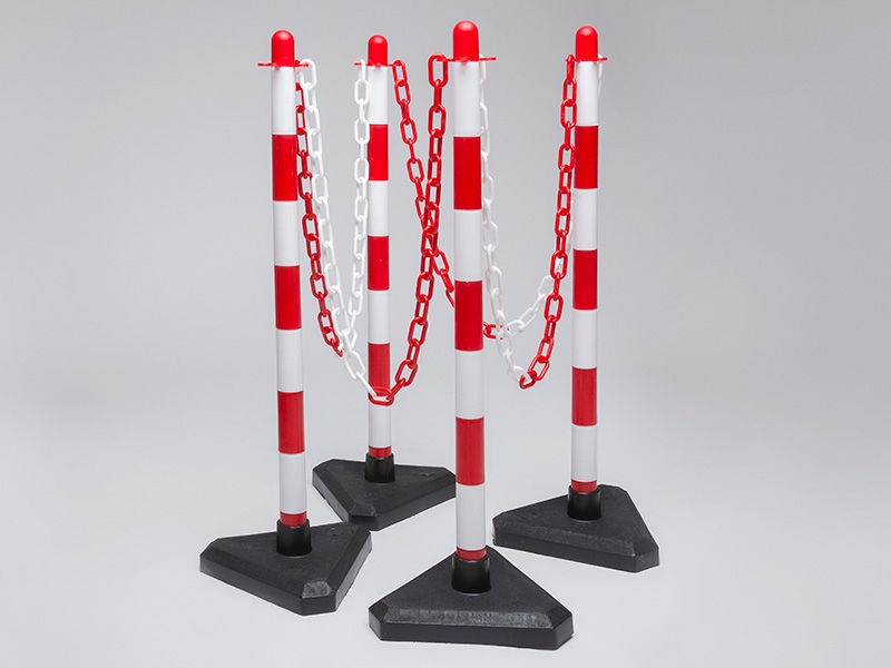 Concrete base post and chain kits are sturdy posts attached to concrete bases and linked with plastic chains. The kit comes with 4 posts & bases, 6m of chain & 10 connectors. Red/white posts, red/white chain, red connector links, red S-hooks. Ideal for outdoor usage.