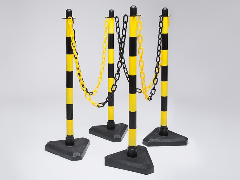 The triangular base provides extra stability even in adverse conditions. Comes with 4 posts & bases, 6m of chain & 10 connectors. Yellow/black posts, yellow/black chain, yellow connector links, yellow S-hooks. Plastic chain provided in 2 meter lengths. Plastic chain thickness – 6mm or 8mm.