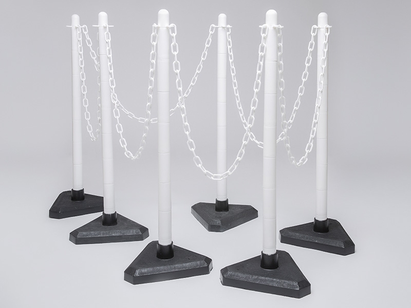 Plastic chain and post bundles are a simple way to manage crowd flow. Can be used both indoor and outdoor. Kit includes 6 posts & bases, 10m of chain & 20 connectors. White posts, white chain, white connector links, white S-hooks.