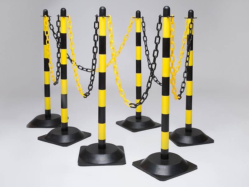 Plastic chain and post bundles are the ideal way to successfully manage traffic or large groups of people. Comes with 6 posts & bases, 10m chain & 20 connectors. Yellow/black post, yellow/black chain, yellow connector links, yellow S-hooks. Chain supplied in 2m lengths. Chain thickness is 6mm or 8mm.