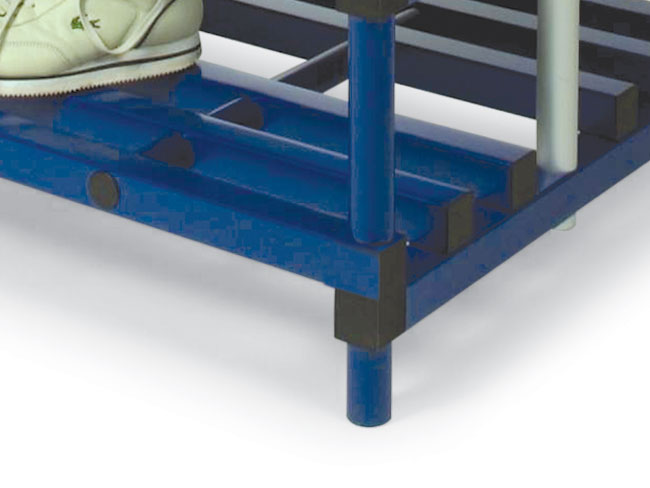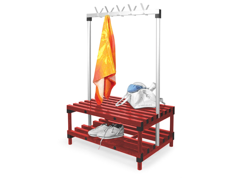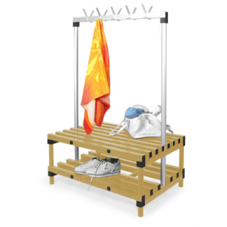 Double sided plastic changing room bench with undershelf for shoes. Rust, rot, corrosion resistant. Ideal for use in damp areas. Easy to assemble. Dismantle and clean.