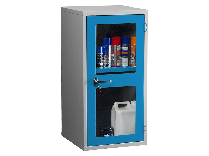 Floor standing cabinet with strong welded steel construction. Polycarbonate door panels allows visibility whilst maintaining security. 1 shelf, adjustable to 25mm pitch. Reinforced doors with Lever lock handles, 2 rods locking top and bottom. Two door keys supplied. Grey BS00A05 body with powder coat finish. Choice of door colour. Dimensions (mm): 915(H) x 457(W) x 457(D).