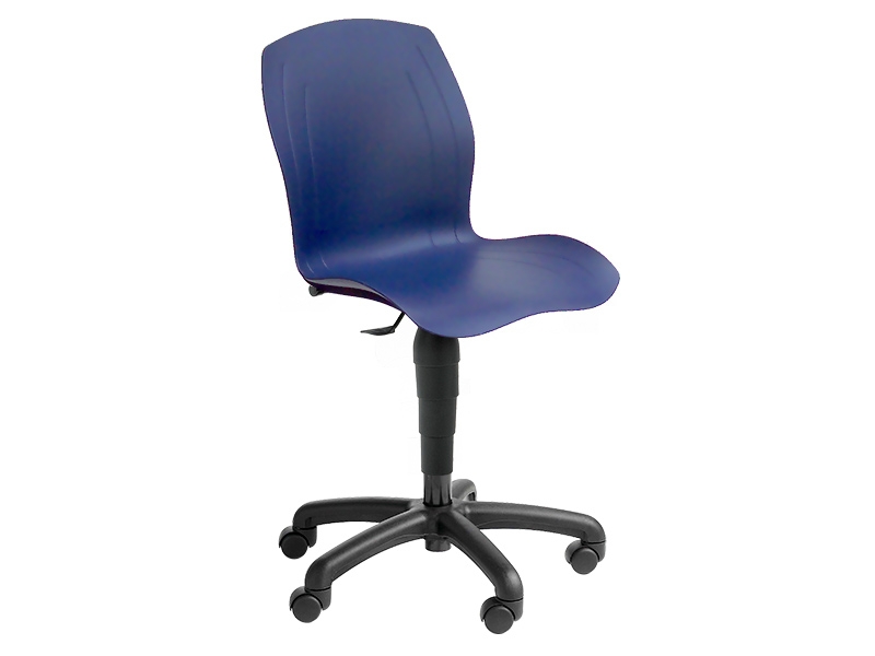 Polypropylene hardwearing chair. 5-star base with castors. Manual screw seat height adjustment 450-590mm. Suitable for food industry or factory floor use. Washable or steam clean.