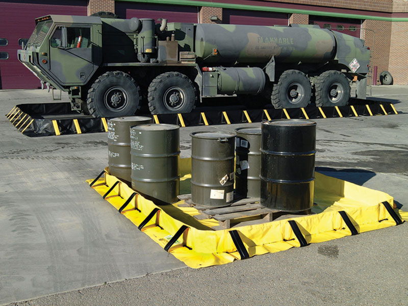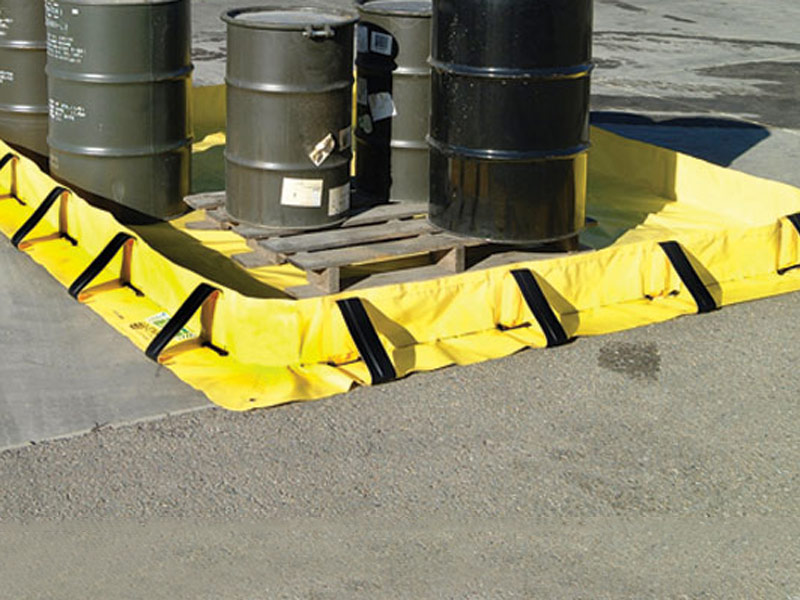 Temporary portable spill containment for chemical application. Lightweight. Immediate protection. Snap-up support strips create a sturdy sidewall when opened. Folds for compact storage.