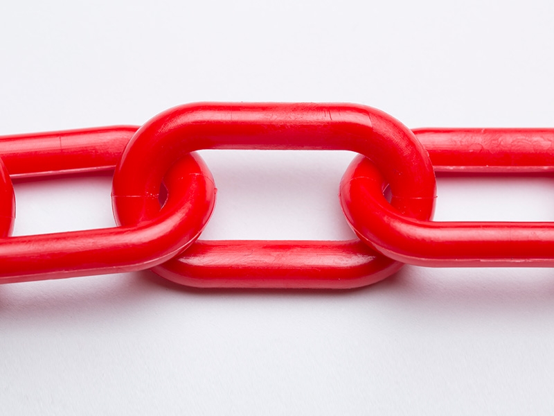 Red 6mm, 8mm or 10mm plastic chain. 24m length, supplied in 12 x 2m pieces with 11 extra connectors. UV stabilised to reduce any colour fade. Polyethylene will not go brittle; has some stretch or ‘give’ in it. Maximum distance between posts; 6mm chain = 3m, 8mm chain 2m, 10mm chain 1.5 (see guide). Chain Link Dimensions: 6mm = 37x22mm ext, 18x11mm int, 8mm = 46x26mm ext, 34x10mm int, 10mm = 72x38mm ext, 55x21mm int. Red chain, links & hooks.