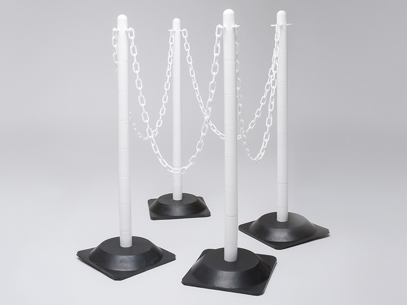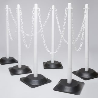 Plastic chain and post bundles are a simple way to manage pedestrian traffic. Kit includes 4 posts & bases, 6m of chain & 10 connectors. Featuring white posts, white chain, white connector links, white S-hooks. Low profile black rubber base reduces risk of tripping. Ideal for use both indoors and outdoors. Chain supplied in 2m lengths with additional connectors.