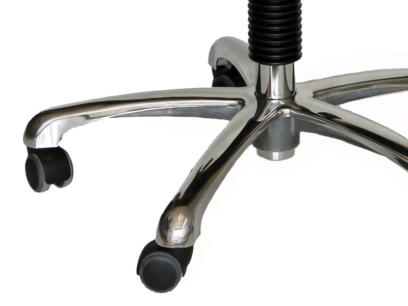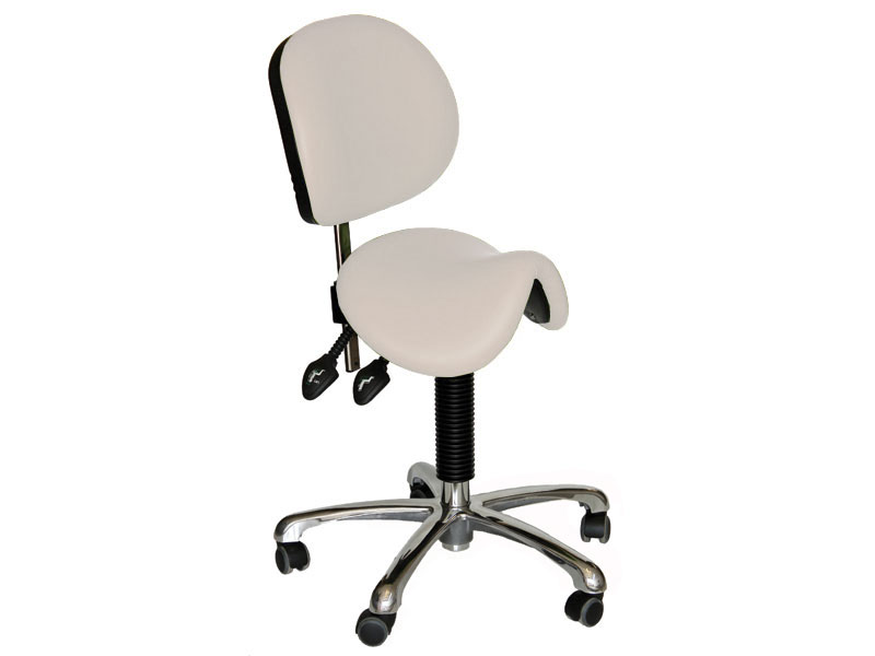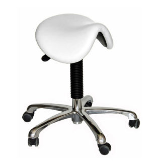 Fully adjustable upholstered seat & backrest. Saddle design helps people with back problems. The seating position both straightens & strengthens the spine. Chrome gaslift, base and castors. 570-740mm seat height – fully adjustable saddle seat.